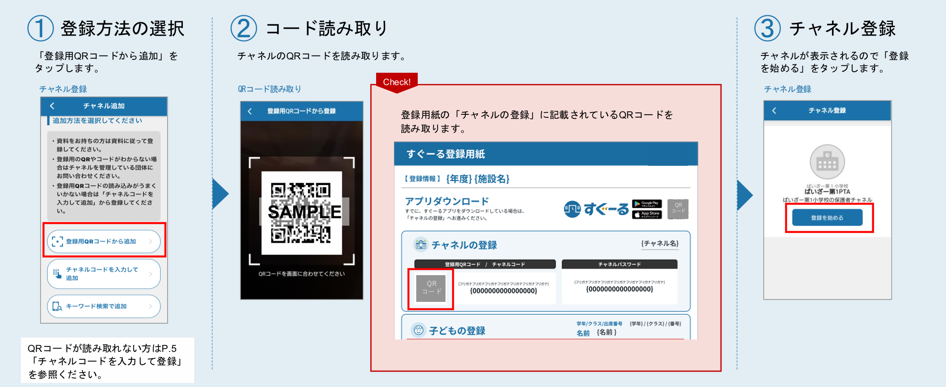 ②すぐーる登録用紙の「チャネルの登録」に記載のQRコードを読み込んでください。