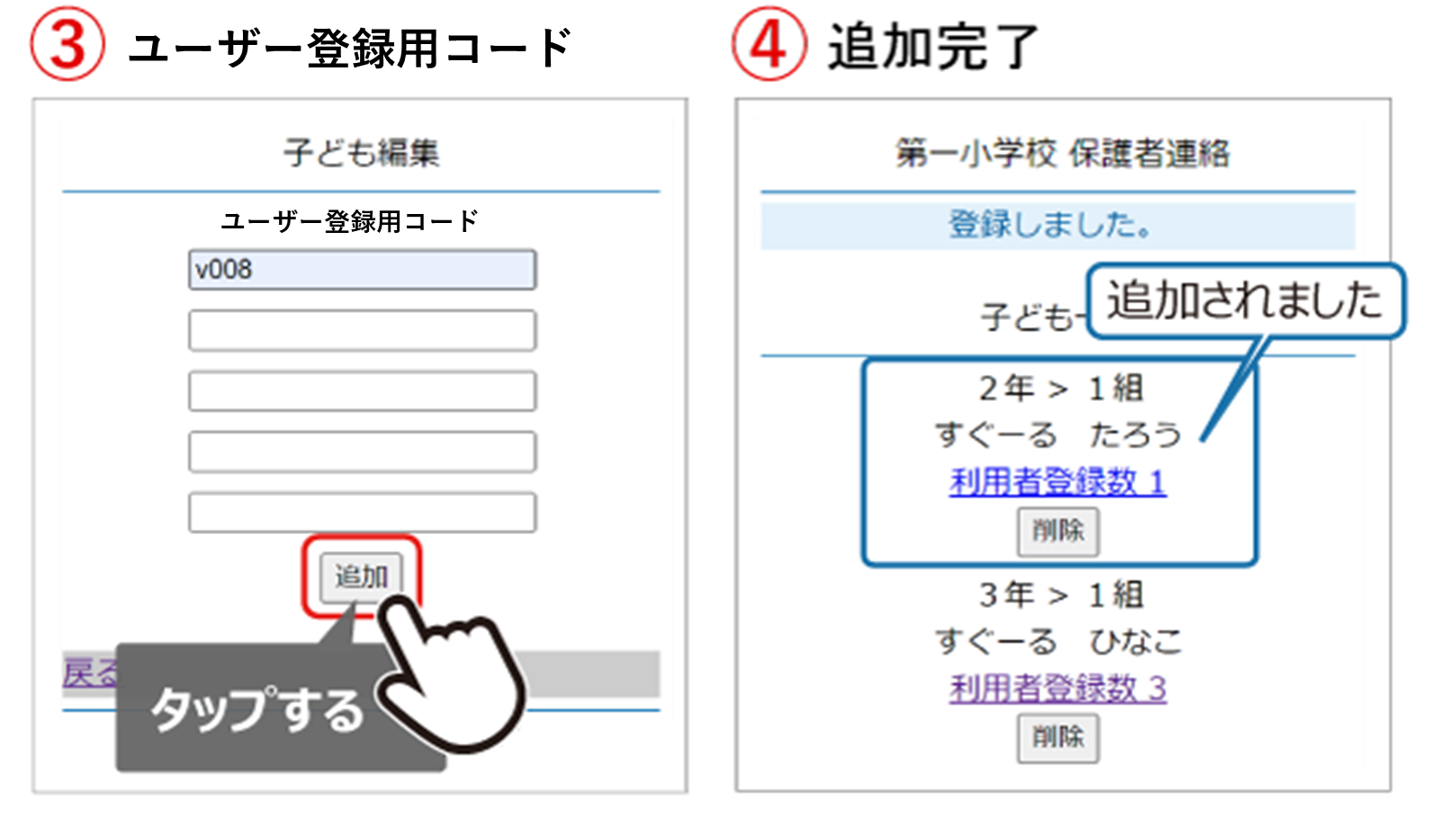 子ども一覧から登録を削除したい子どもの「削除」をタップします。