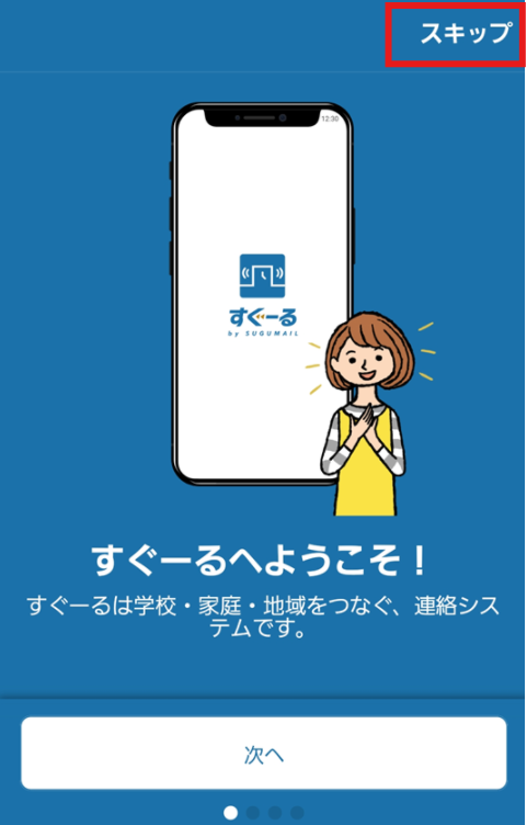 ① アプリの起動直後の画面です。ここでは右上の「スキップ」をタップします。