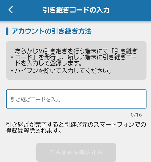 ④ この画面で16桁の引継コードを入力します。