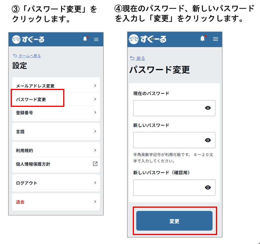 「すぐーるWeb」でパスワードを変更する手順は、以下の通りです。