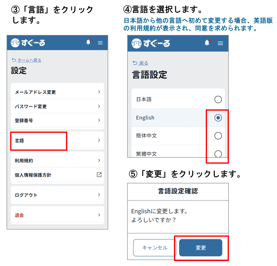 ※言語設定を変更後、メッセージが反映されるまでに最大5分程度かかる場合があります。